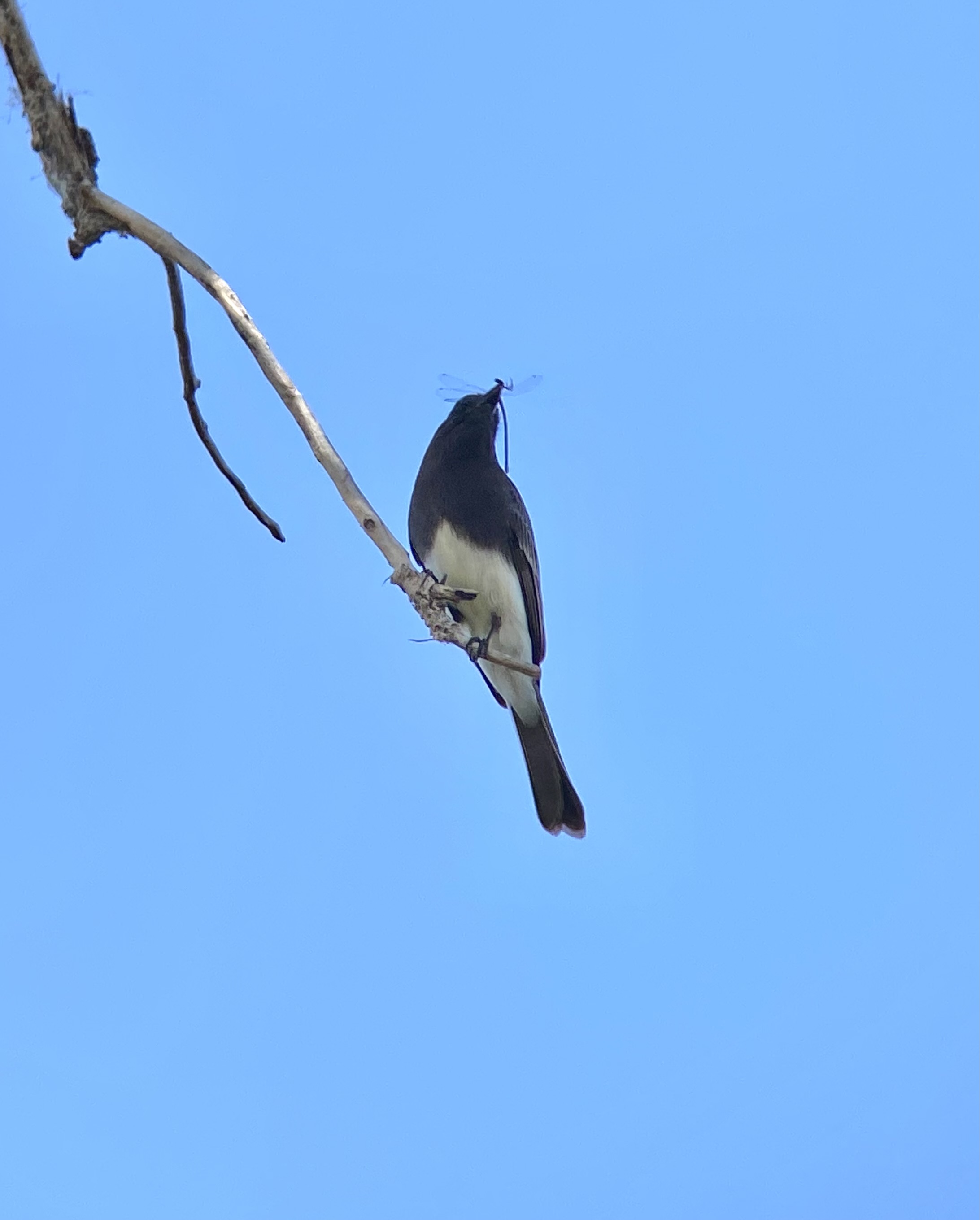 black phoebe eating some kind of damselfly. rip damselfly. my first black phoebe sighting was so odd. I was very aware of them, knew they were in the area, but had never seen one. and then one day I looked in my backyard. and there was a black phoebe. just for a moment. and then it flew away. it was like seeing a celebrity. I have not seen a single one in my neighborhood since then, and I don't know why that bird was there that day.